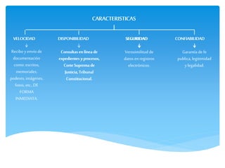 El documento describe las características de la informática jurídica, incluyendo la velocidad, seguridad, confiabilidad y disponibilidad que permite el envío y recepción inmediata de documentos electrónicos, así como consultas en línea de expedientes y procesos de la Corte Suprema de Justicia y el Tribunal Constitucional de forma segura y veraz. También menciona las ventajas de economía, comodidad y disminución de gastos y tiempo que ofrece al facilitar el acceso y tramitación de documentos sin necesidad de presentarse