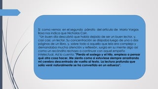 El documento discute cómo el exceso del uso de la realidad virtual y la dependencia en la tecnología pueden afectar negativamente la capacidad de lectura y atención de las personas. Nicholas Carr observó que su propia capacidad de lectura profunda se había debilitado, y que la lectura requería un gran esfuerzo. Además, una profesora notó que sus estudiantes ya no leen libros enteros debido a su dependencia en encontrar respuestas rápidas en internet. Por lo tanto, aunque la tecnología puede ser beneficiosa, el ex