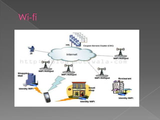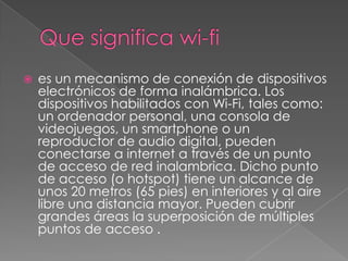 Wi-Fi es un mecanismo para conectar dispositivos electrónicos de forma inalámbrica a Internet a través de puntos de acceso con un alcance de 20 metros. Wikis son sitios web cuyas páginas pueden ser editadas por múltiples usuarios y cuyos textos forman enlaces cuando se escriben entre dobles corchetes.