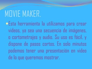 Este documento describe diferentes herramientas digitales como Movie Maker, Blogger, Prezi y Dropbox. Movie Maker permite crear videos de manera fácil adjuntando imágenes, audio y efectos. Blogger es una plataforma para compartir notas, imágenes y comentarios a través de un blog personalizable. Prezi ayuda a crear presentaciones multimedia en la web con plantillas. Dropbox es una plataforma en la nube para almacenar y compartir archivos de manera segura desde cualquier lugar.