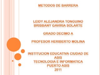 Los métodos anticonceptivos de barrera como los condones masculinos y femeninos evitan que los espermatozoides lleguen al útero para fertilizar un óvulo. Los condones deben colocarse correctamente antes de iniciar las relaciones sexuales para bloquear el paso de los espermatozoides y prevenir embarazos e infecciones de transmisión sexual. Otros métodos de barrera como el diafragma y la esponja también bloquean físicamente el paso de los espermatozoides cuando se usan correctamente.