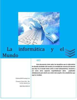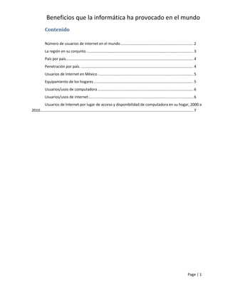 Este documento resume los principales beneficios que la informática ha traído al mundo y la cantidad de usuarios de Internet a nivel global y en Latinoamérica. Explica que actualmente hay aproximadamente 173.6 millones de usuarios de Internet en Latinoamérica, con Brasil y Argentina teniendo la mayor cantidad. También describe las tasas de penetración de Internet en diferentes países de la región, con Chile teniendo la más alta, y provee estadísticas sobre el uso de computadoras e Internet en México.