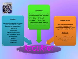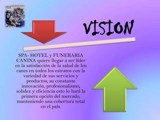 El documento presenta un proyecto de una SPA hotel y funeraria canina en Quito, Ecuador. El proyecto busca brindar servicios de cuidado y hospedaje para perros, así como servicios funerarios. Se ubicará al norte de Quito y contará con transporte canino para recoger a los perros de diferentes zonas de la ciudad. El proyecto también incluye una sección sobre diferentes razas caninas.