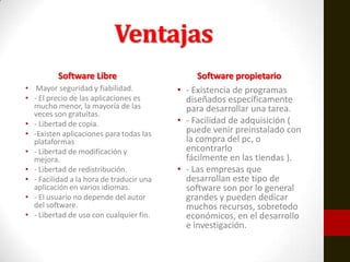 El documento compara las ventajas y desventajas del software libre y propietario. Entre las ventajas del software libre se encuentran la mayor seguridad, bajo o nulo costo, libertad de modificación y distribución. Entre las desventajas están una menor compatibilidad con hardware y interfaces menos amigables. Para el software propietario, las ventajas son programas específicos para tareas y soporte exclusivo del propietario, mientras que las desventajas son menos plataformas compatibles, costos más altos e imposibilidad
