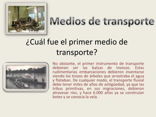 El documento resume la historia del desarrollo de los medios de transporte. Explica que los primeros medios de transporte que utilizó el hombre fueron caminar y luego usar troncos de árboles como balsas y ruedas. Más tarde, los primeros medios de transporte terrestre fueron la domesticación de animales como caballos y bueyes, que se usaron durante miles de años. Finalmente, en los últimos dos siglos aparecieron nuevos medios como el ferrocarril y el transporte aéreo a principios del siglo XX.