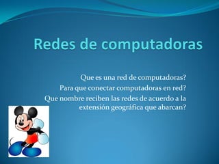 Una red de computadoras conecta uno o más equipos para compartir recursos como videojuegos, imágenes y archivos sin importar la ubicación física. Existen diferentes tipos de redes definidas por su alcance geográfico como LAN, WAN, PAN y MAN.