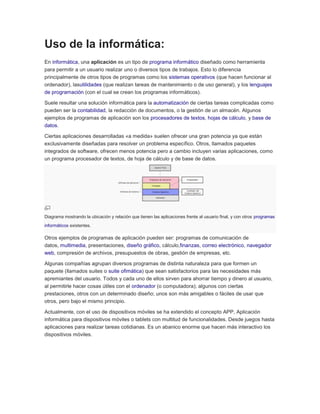 La informática es la ciencia que estudia el procesamiento automático de la información utilizando dispositivos electrónicos y sistemas computacionales. Las aplicaciones informáticas automatizan tareas complejas en diversas áreas como la gestión empresarial, almacenamiento de datos, control de procesos industriales, entretenimiento y más. Actualmente es difícil encontrar un área que no use la informática de alguna forma, ya sea para usos sencillos o cálculos científicos complejos.