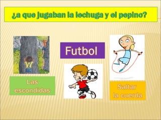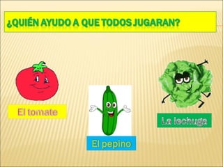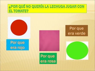 El cuento trata sobre una zanahoria y un tomate que son amigos y juegan juntos. Un día, un pimiento rojo les pregunta si puede jugar con ellos, pero la zanahoria no lo deja porque es de color rojo. El tomate se compadece del pimiento y lo invita a jugar. Luego convencen a la zanahoria de que deje jugar al pimiento también.