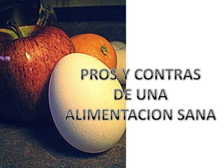 Este documento presenta información sobre la alimentación humana. Se define la alimentación como la ingesta de alimentos para obtener nutrientes y energía. Una alimentación sana implica variar los alimentos para obtener todos los nutrientes necesarios, mientras que una mala alimentación carece de variedad. La tecnología ha permitido mayor disponibilidad y durabilidad de los alimentos, pero también ha llevado a alimentos más procesados con exceso de un solo nutriente.