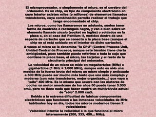 El microprocesador es el componente electrónico central de una computadora que contiene millones de transistores y es responsable de ejecutar las instrucciones del sistema. Los microprocesadores vienen en forma de chips rectangulares negros que se colocan en la placa base de la computadora y su velocidad se mide en megahertz o gigahertz.