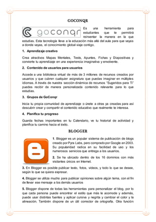 Este documento presenta resúmenes breves de varias herramientas web y ofimáticas útiles para estudiantes, incluyendo GoConqr para el aprendizaje colaborativo en línea, Blogger para la creación de blogs, Outlook para el correo electrónico y la agenda, Prezi para presentaciones dinámicas, PowerPoint, Access para bases de datos, Dropbox para el almacenamiento en la nube, Google Drive, y SlideShare para compartir presentaciones.
