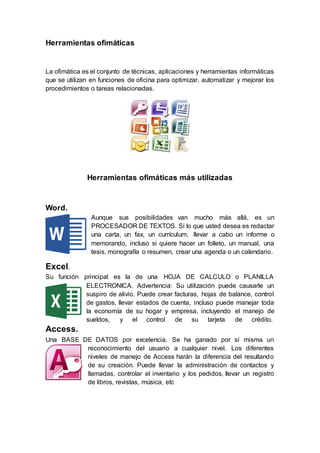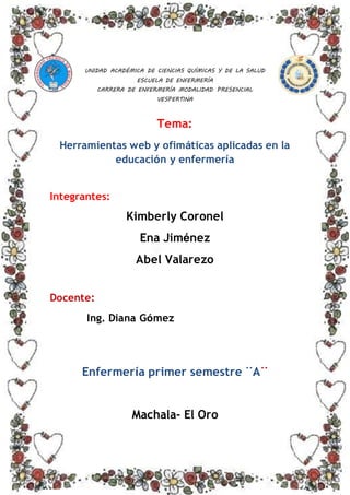 Este documento describe varias herramientas web y ofimáticas aplicadas en la educación y enfermería, incluyendo Word, Excel, Access, PowerPoint, Outlook, blogs, Dropbox, Google Drive, GoConqr, SlideShare, Gmail, Mendeley, Edmodo e Index de Enfermería. También explica cómo la informática se utiliza en enfermería para gestionar datos e información relacionados con tareas y procedimientos, y cómo ha permitido el desarrollo de sistemas para mejorar la eficiencia y calidad.