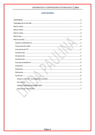 El documento describe diferentes tipos de topologías de redes LAN, incluyendo redes en anillo, árbol, malla, bus y estrella. También explica el espectro radioeléctrico y diferentes frecuencias utilizadas para radio, televisión y telefonía.