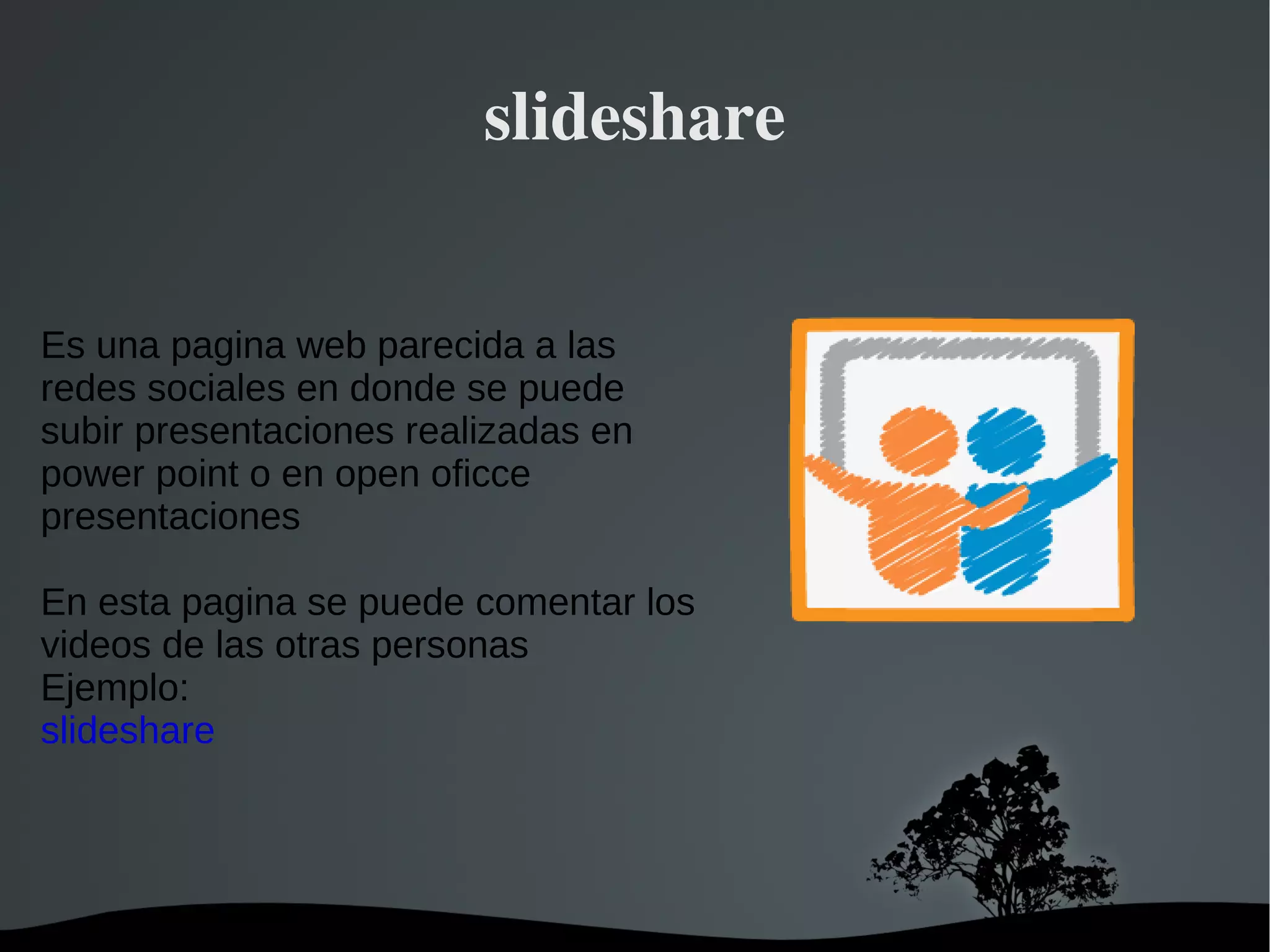 Slideshare, Facebook y YouTube son sitios web de redes sociales donde los usuarios pueden publicar presentaciones, fotos, videos y comentar los contenidos de otros. Hotpotatoes y Smartboard son programas educativos que ayudan a crear actividades interactivas y grabar presentaciones con audio. Myspace, Hi5, Sonico y Bebo también son redes sociales donde los usuarios interactúan a través de perfiles, mensajes y contenidos compartidos.