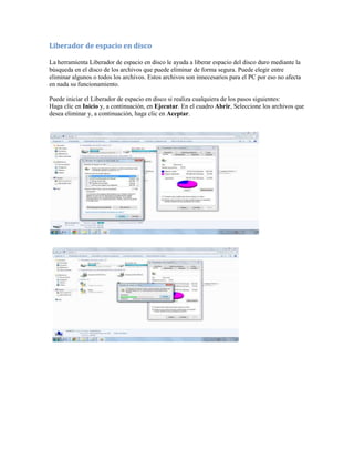 Este documento proporciona información sobre varias herramientas de Windows como el Liberador de espacio en disco, Desfragmentador de discos, Punto de restauración, Restaurar sistema, Copia de seguridad, Centro de seguridad de Windows, Firewall de Windows, Windows Update y Copias de Seguridad y Restauración. Explica cómo funcionan estas herramientas y los pasos para utilizarlas.