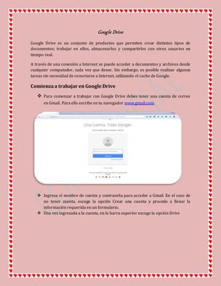 Google Drive es una suite de productividad en la nube que permite crear, editar y almacenar documentos, hojas de cálculo y presentaciones. Los usuarios pueden acceder y compartir estos archivos desde cualquier dispositivo con una conexión a Internet. Google Drive guarda automáticamente los cambios realizados para evitar la pérdida de datos.