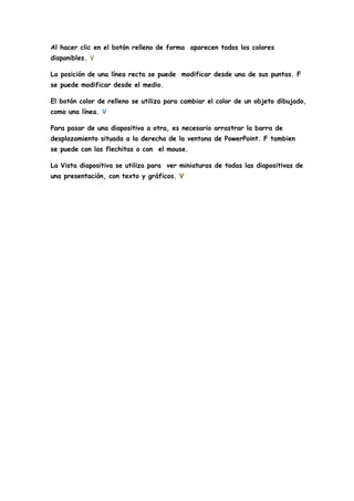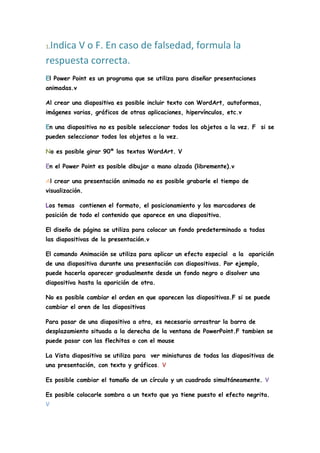 Este documento contiene una serie de afirmaciones sobre las funcionalidades del programa PowerPoint. Indica si cada afirmación es verdadera (V) o falsa (F), y en caso de ser falsa, corrige la afirmación. Algunas funcionalidades confirmadas son que es posible incluir diferentes objetos en una diapositiva, girar textos WordArt, aplicar efectos de animación, y cambiar el tamaño de formas simultáneamente. Sin embargo, no es posible seleccionar todos los objetos a la vez en una diapositiva o modificar la posición de una lí