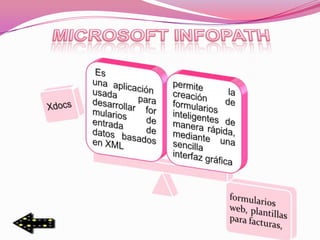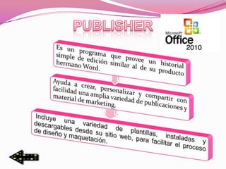 Este documento describe brevemente 11 programas de Microsoft Office: Word (procesador de textos), Excel (hoja de cálculo), Access (base de datos), PowerPoint (presentaciones), Outlook (correo electrónico y agenda), Publisher (diseño de publicaciones), InfoPath (formularios), Visio (diagramas), Project (gestión de proyectos), Accounting Express (contabilidad) y OneNote (toma de notas). Cada programa se describe en una o dos oraciones sobre su propósito y funcionalidad principal.