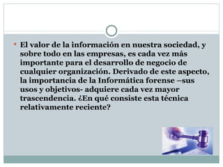 La informática forense permite resolver conflictos relacionados con la seguridad de la información y la protección de datos mediante la identificación, recuperación, análisis y presentación de pruebas electrónicas para su uso legal. Consiste en investigar sistemas de información para detectar evidencia de vulneraciones del sistema y puede usarse con fines preventivos o correctivos. Utiliza metodologías como la recopilación segura de datos digitales sin alterarlos y su catalogación y documentación para un posterior análisis que permita elaborar un dictamen fundamentado.