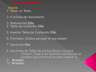 El documento lista las diferentes opciones disponibles en la interfaz de Microsoft Word 2007, incluyendo opciones de menú como Archivo, Insertar y Ver, herramientas como Cortar y Pegar, y elementos comunes como documentos, imágenes y sitios de red. También incluye instrucciones paso a paso para formato de texto, inserción de encabezados, imágenes y pies de página.