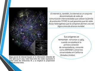 El documento describe la evolución de Internet desde sus orígenes en 1969 como la red ARPANET hasta la actualidad. Explica que Internet es una red descentralizada de redes interconectadas que usan protocolos TCP/IP para formar una red lógica global. También resume estadísticas actuales sobre el número de usuarios de Internet y redes sociales en diferentes regiones del mundo.