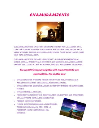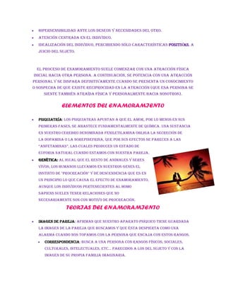 El enamoramiento se caracteriza por una intensa atracción emocional y física hacia otra persona, la cual genera euforia y satisfacción. Se basa en la química cerebral, específicamente la secreción de dopamina y norepinefrina que producen una sensación similar a las anfetaminas. También tiene un componente genético vinculado al instinto de procreación. Existen varias teorías sobre los orígenes del enamoramiento, como la búsqueda de una pareja protectora o aquella que se asemeje a la imagen ideal creada desde la inf