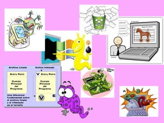 El documento detalla el concepto de virus informático, describiendo distintos tipos como el caballo de Troya, gusanos, y virus de macros, entre otros, que afectan el funcionamiento de las computadoras. También explica la diferencia entre hackers y crackers, y destaca la importancia de la seguridad informática en las empresas para proteger los archivos cruciales para su operación. Finalmente, menciona diversas soluciones antivirus y la función de las licencias de software.