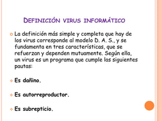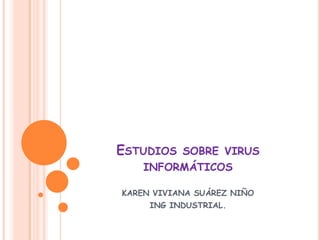 Este documento trata sobre estudios de virus informáticos. Define un virus informático como un programa dañino, autorreproductor y subrepticio. Explica que los virus se clasifican según cómo infectan la computadora, como programas, de arranque, múltiples o BIOS. Describe el modus operandi de los virus al ejecutarse en un programa infectado, alojarse en la RAM, tomar control del sistema operativo e infectar otros archivos antes de replicarse al añadir su código al programa original.