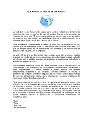 La Web 2.0 proporciona herramientas útiles para las carreras y empresas, como permitir la participación de múltiples miembros y el cumplimiento de objetivos compartidos. Herramientas como Joomla, Drupal, blogs, wikis y redes sociales pueden usarse para dar a conocer una empresa, administrar conocimientos, crear aplicaciones y aprovechar los efectos de red. Estas herramientas son importantes para las carreras de informática empresarial al permitir la publicación de contenido y servicios en línea.