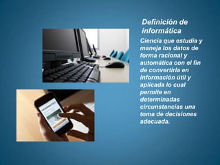 La informática estudia y maneja datos de forma racional y automática para convertirlos en información útil que permita la toma de decisiones. Se divide en varias disciplinas como computación, cibernética, robótica, nanotecnología e inteligencia artificial. La computación se ocupa del hardware y software para procesar y comunicar información, mientras que la informática se encarga del tratamiento automático de información y aspectos como software, hardware y estructura de las computadoras.