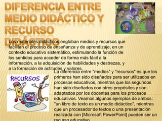 El documento define los materiales didácticos como medios y recursos que facilitan el proceso de enseñanza y aprendizaje estimulando los sentidos. Explica que los medios han sido diseñados para procesos educativos mientras que los recursos son adaptados de otros usos. También describe cuatro características esenciales de los medios educativos: recursos de instrucción, experiencia mediadora, organización de la instrucción y equipo técnico.