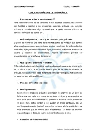 El documento proporciona información sobre conceptos básicos de informática, incluyendo el uso del escritorio, el panel de control, el significado de formatear, y las funciones de opciones como el desfragmentador y liberador de espacio en disco. También explica el propósito de un antivirus y proporciona detalles sobre el antivirus NOD32. Finalmente, describe los iconos comunes y sus funciones, y explica el uso de combinaciones de teclas en Windows.