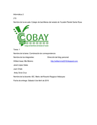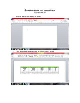 Este documento proporciona instrucciones para realizar una tarea de combinación de correspondencia en Word. Los estudiantes deben crear una lista de datos y credenciales de estudiantes usando tablas y luego combinar esta información en cartas personalizadas utilizando la herramienta de correspondencia de Word. Finalmente, los estudiantes comparten su experiencia realizando esta actividad en parejas.
