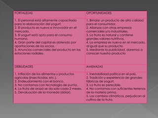 El documento presenta un plan para crear y comercializar un nuevo producto llamado "Yogurt de Aratá". El plan describe la necesidad de ofrecer un producto de alta calidad para satisfacer a los clientes y hacerlo accesible. Detalla que el objetivo es dar a conocer el producto y convertirse en líderes del mercado nacional brindando un excelente servicio. Finalmente, presenta un análisis FODA para considerar las fortalezas, oportunidades, debilidades y amenazas de la empresa antes de iniciar las operaciones comerciales.