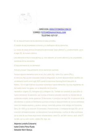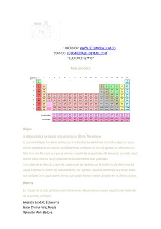El documento proporciona información sobre la historia y el origen de la tabla periódica de los elementos. Explica que Dmitri Mendeleev fue el primero en darse cuenta de que al ordenar los elementos por masa atómica, ciertas propiedades se repetían periódicamente. Más adelante, se descubrió que esto se debía a la estructura electrónica de los átomos. También menciona otros químicos como Newlands y Döbereiner que realizaron tempranos intentos de clasificar los elementos.