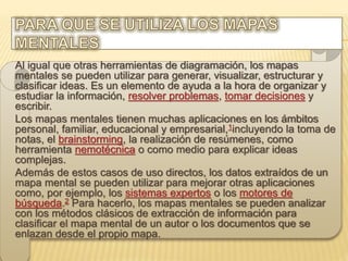 Los mapas mentales son diagramas que representan palabras, ideas y conceptos relacionados con una idea central. Se utilizan para extraer y memorizar información de manera lógica y creativa. Pueden usarse para generar, visualizar y clasificar ideas, y son útiles para organizar información, resolver problemas, tomar decisiones y escribir. Los mapas mentales tienen aplicaciones en ámbitos personales, educativos y empresariales como la toma de notas y el resumen de información.