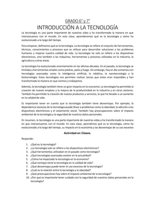 Este documento presenta una introducción al tema de tecnología y medio ambiente en grados 8° y 9°. Explica que la tecnología puede usarse tanto para proteger el medio ambiente, a través de monitoreo, energías renovables y agricultura sostenible, como tener efectos negativos como contaminación y emisiones. También presenta formas de reducir el uso de papel mediante la tecnología para conservar recursos.