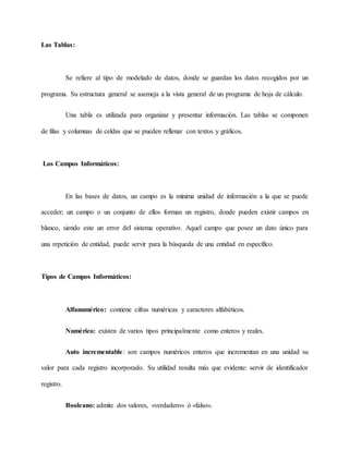 Access es un software de bases de datos que permite gestionar información en tablas. Las tablas contienen filas y columnas para organizar datos en campos de diferentes tipos como texto, números o fechas. Las consultas permiten buscar y recuperar datos almacenados. Los formularios y informes son usados para ingresar, visualizar y generar reportes de la información respectivamente.