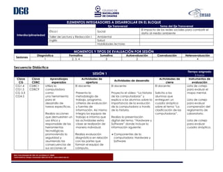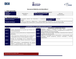 Este documento presenta una secuencia didáctica de 12 horas para el bloque 1 del curso Informática I. El bloque se enfoca en conceptos básicos de informática y ciudadanía digital. Incluye competencias a desarrollar, elementos integradores, y detalles de 4 sesiones que abordan temas como hardware, software, Windows, y ciudadanía digital a través de presentaciones, prácticas de laboratorio, y actividades de evaluación.