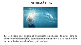 Este documento resume los componentes fundamentales de una computadora personal, incluyendo el software, hardware, CPU, placa madre, memoria RAM y ROM, microprocesador, pila, placas controladoras y periféricos de entrada, salida y entrada/salida. Explica que la informática estudia el procesamiento automático de datos y que una computadora personal está compuesta de elementos físicos (hardware) y programas (software) que gestionan los recursos.