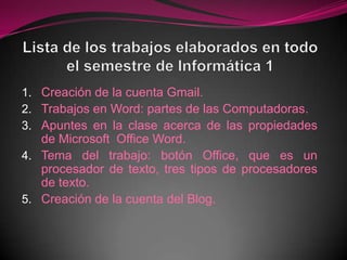 Este documento presenta una lista de los trabajos realizados por Gabriela del Rocío Cruz Méndez durante su primer semestre de la Licenciatura en Educación Primaria en el Instituto Normal Quevedo. Incluye la creación de cuentas de correo, blog y otras plataformas, así como trabajos en Word sobre partes de la computadora y planes de estudio utilizando formatos y herramientas de Word.