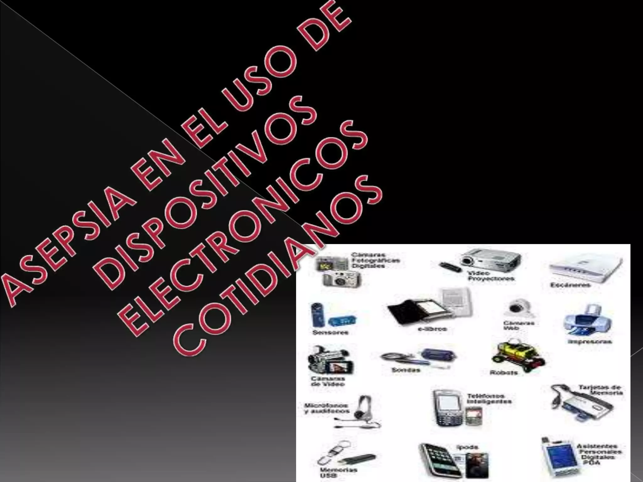 Este documento trata sobre la importancia de la asepsia en el uso de dispositivos electrónicos cotidianos. Se justifica el estudio debido a que estos dispositivos atraen muchas bacterias que no son visibles y pueden transmitir infecciones. Los objetivos son concientizar a las personas sobre la limpieza de los dispositivos para prevenir infecciones y reducir el número de bacterias en ellos. La prevención incluye limpiar los dispositivos con antibacteriales y lavarse las manos antes y después de usarlos. La mayoría de los estudiantes encuestados us