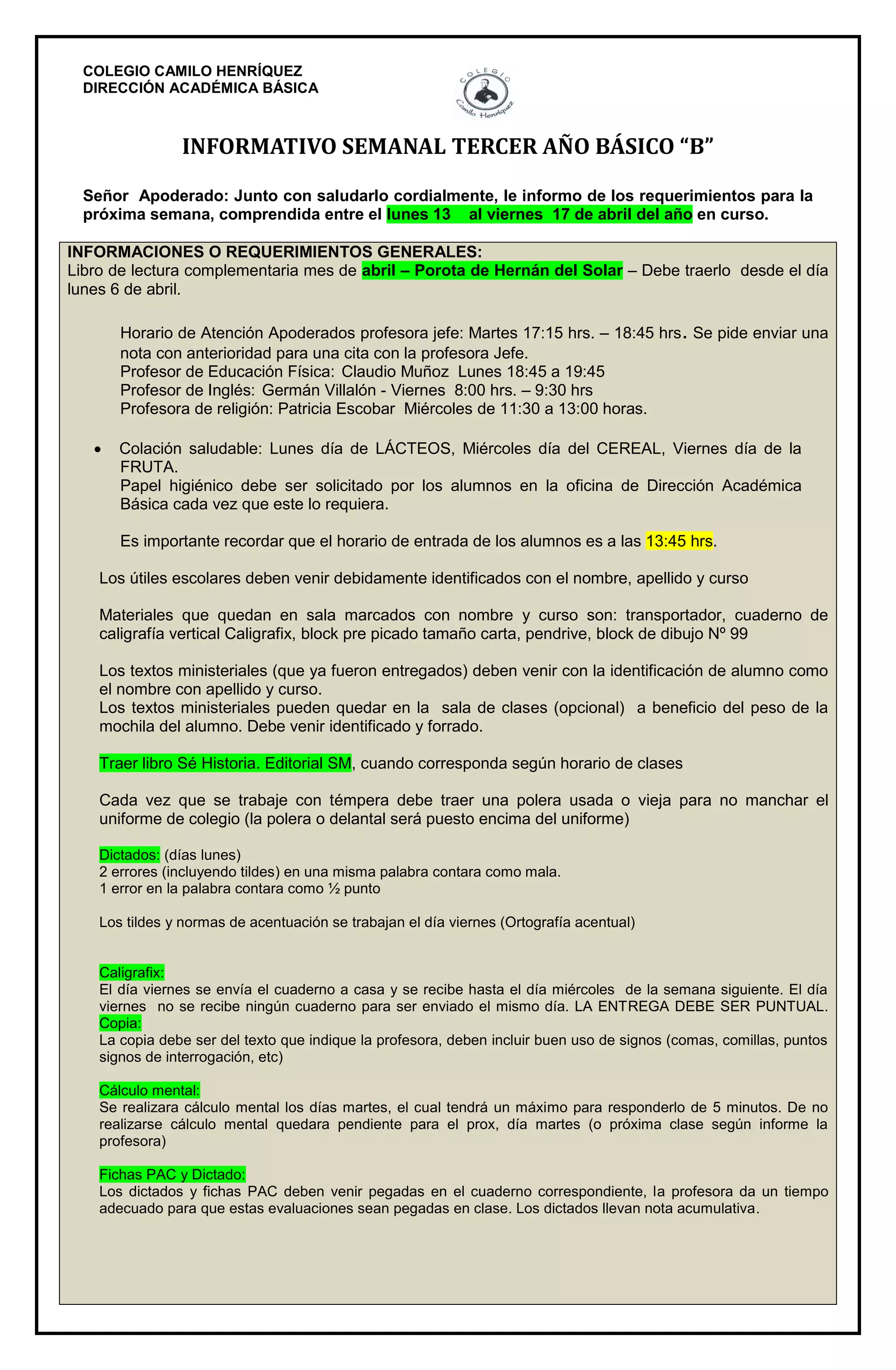 Este documento resume los requerimientos y actividades académicas para los estudiantes de tercer año básico "B" en el Colegio Camilo Henríquez para la semana del 13 al 17 de abril. Incluye información sobre libros, horarios de profesores, materiales requeridos, evaluaciones y contenidos académicos para diferentes asignaturas como lenguaje, matemáticas e inglés. También detalla un proyecto entre lenguaje, tecnología y religión sobre la importancia de comunicarse.
