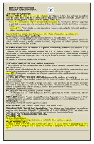 Este documento proporciona información sobre los requerimientos y actividades académicas para los estudiantes de primer año básico "B" en el Colegio Camilo Henríquez durante la semana del 20 al 24 de abril. Incluye detalles sobre materiales requeridos, horarios de clases, contenidos que se cubrirán en cada asignatura, y eventos como simulacros y celebraciones. También incluye enlaces de apoyo para los contenidos académicos.