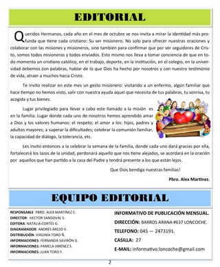 Este boletín parroquial mensual contiene varias secciones, incluyendo una entrevista con María Isabel Guzmán, una profesora de educación especial. Ella habla sobre su participación a largo plazo en la parroquia y cómo esto ha sido significativo para su desarrollo personal y profesional. También contiene secciones sobre nuevos ministros, la historia de una comunidad, un retiro de confirmación y avisos parroquiales. Un artículo continúa examinando el Credo católico y los misterios de la fe