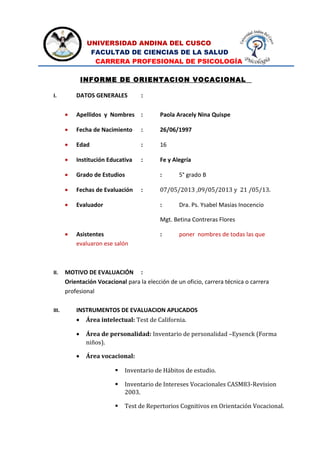Este documento presenta tres informes de orientación vocacional para estudiantes del colegio Fe y Alegría en Cusco, Perú. Cada informe incluye datos personales del estudiante, los instrumentos de evaluación aplicados como pruebas de inteligencia y personalidad, y recomendaciones vocacionales basadas en los resultados de las evaluaciones.