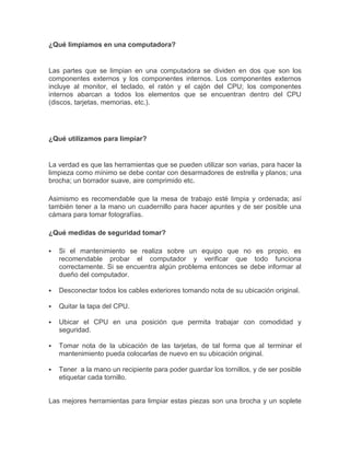 El documento habla sobre el mantenimiento preventivo de una computadora. Explica que el mantenimiento preventivo incluye revisar periódicamente aspectos de hardware y software para prevenir fallas antes de que ocurran. También describe cómo limpiar una computadora removiendo el polvo de partes internas y externas usando herramientas como brochas y aire comprimido. Además, da consejos sobre medidas de seguridad al limpiar una computadora que no es propia.