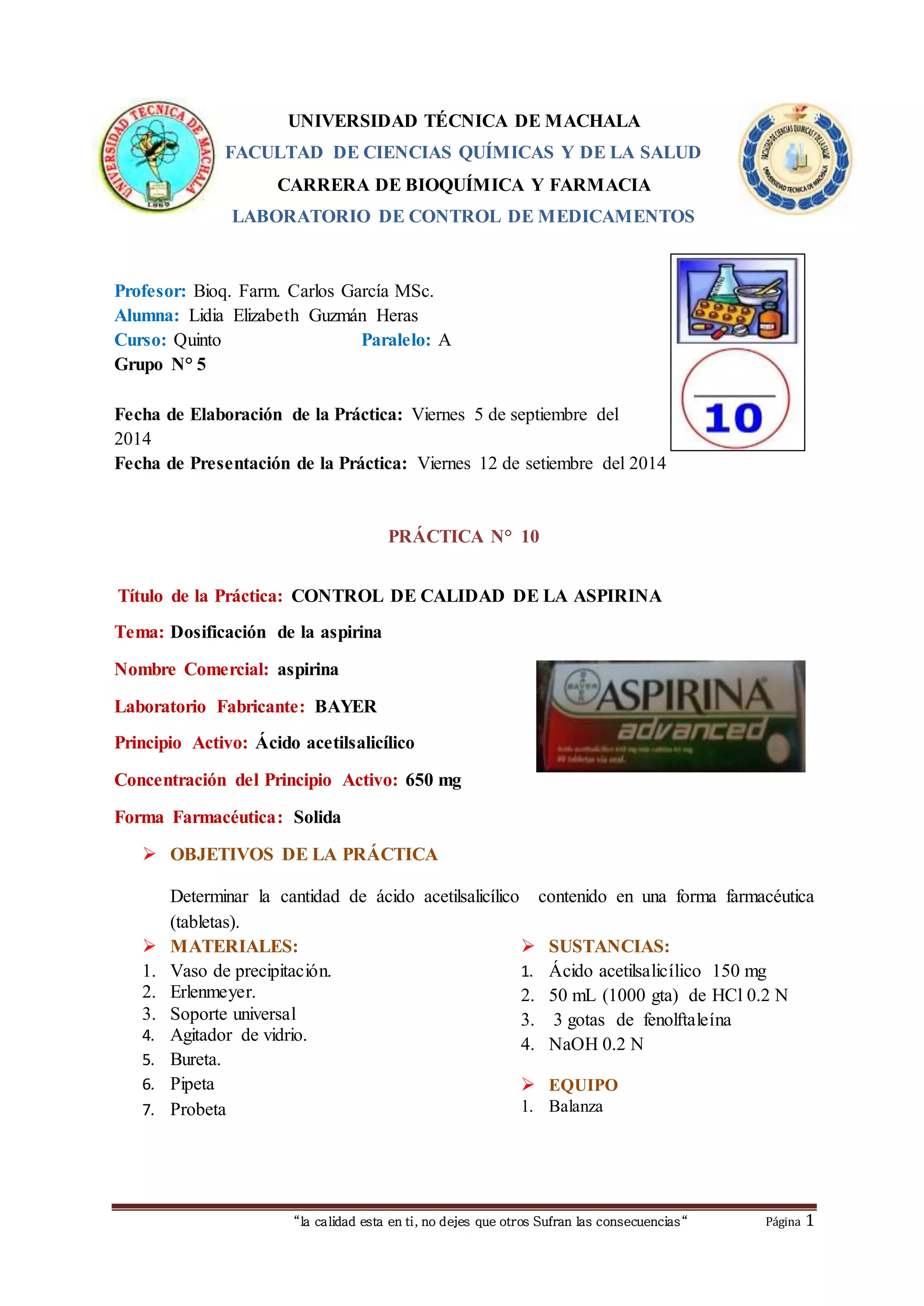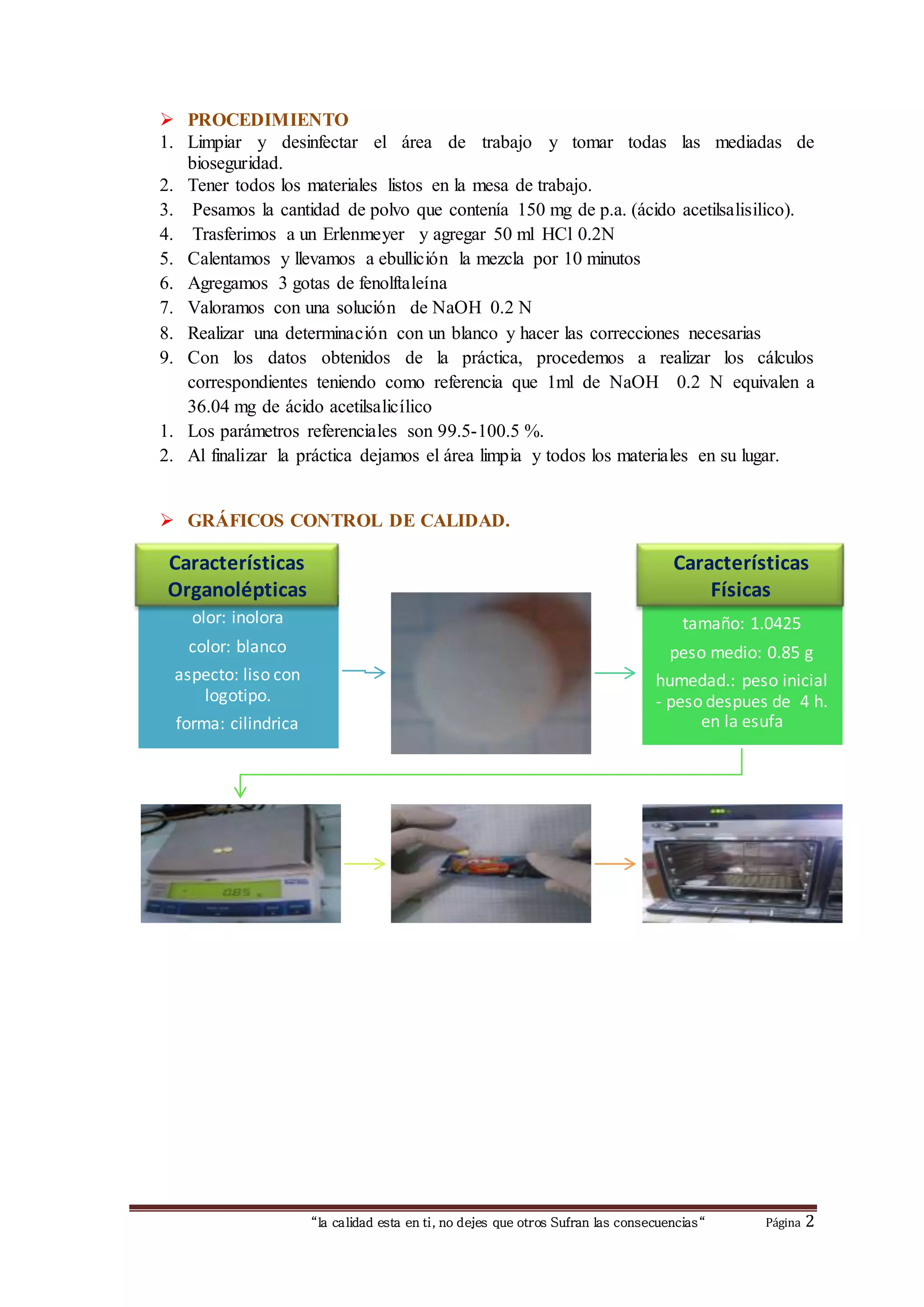 Este documento presenta los resultados de un experimento de control de calidad de la aspirina. Se realizó una titulación ácida de la aspirina usando NaOH para determinar la cantidad de ácido acetilsalicílico presente. Los cálculos mostraron que la aspirina contenía un 98.26% de principio activo, lo cual está dentro de los parámetros de referencia requeridos. Por lo tanto, la aspirina cumple con los estándares de calidad. Adicionalmente, se incluyen detalles sobre el objetivo, materiales, procedimiento, observaciones y conclusion