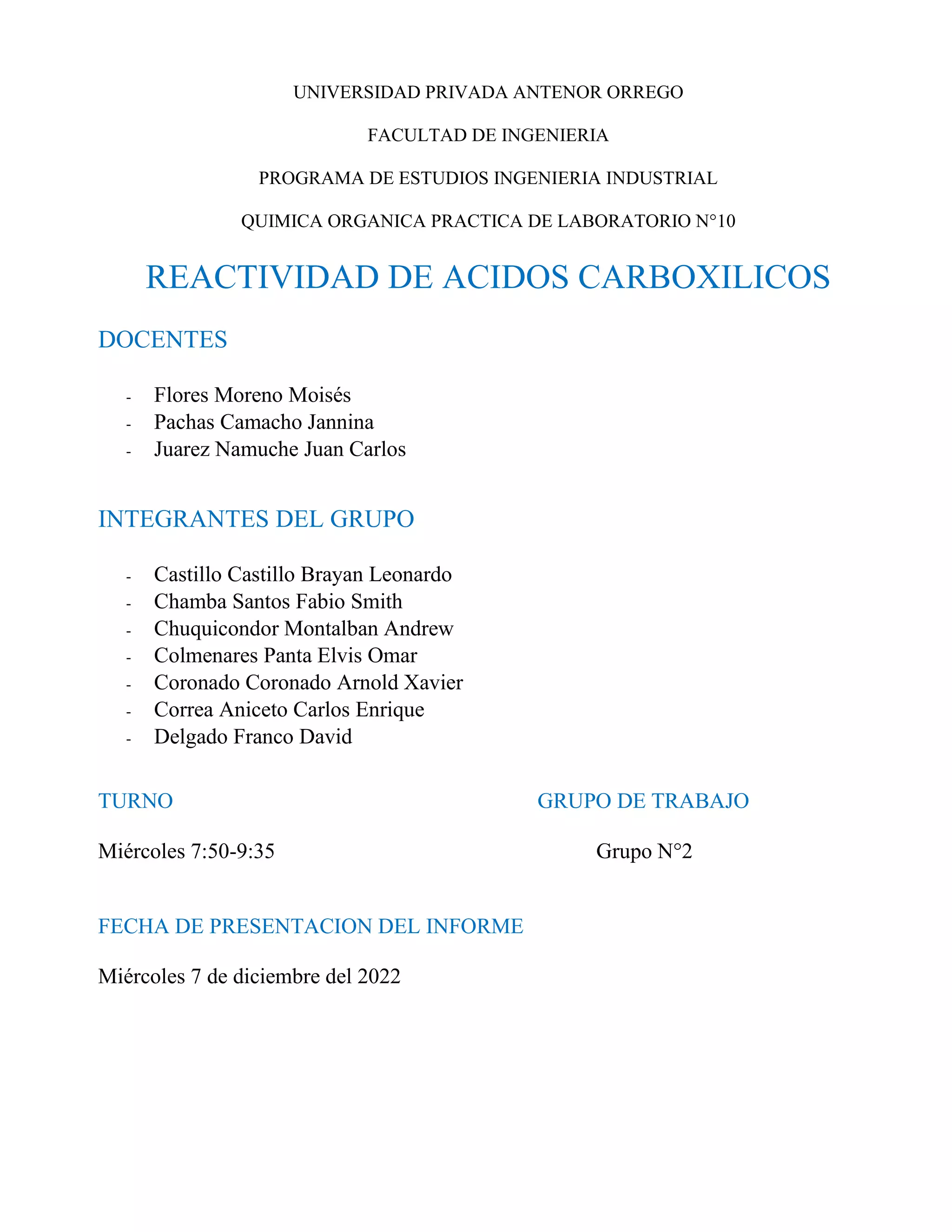 Este documento presenta los detalles de la Práctica 10 de Química Orgánica de Laboratorio sobre la reactividad de los ácidos carboxílicos. La práctica incluye tres experimentos: 1) la oxidación de benzaldehído para obtener ácido benzoico, 2) la obtención de ácido acético a partir de acetato de sodio, y 3) la síntesis de un éster a partir de ácido salicílico y metanol. Los estudiantes deben llevar a cabo los procedimientos experimentales, obser