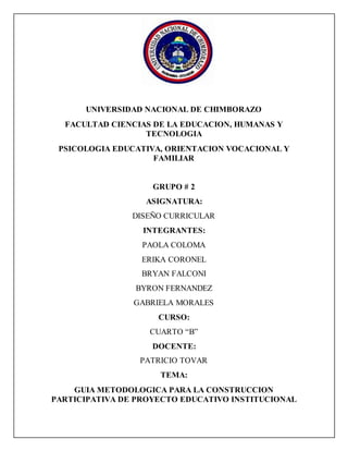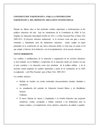 Este documento presenta una guía metodológica para la construcción participativa del Proyecto Educativo Institucional (PEI) en instituciones educativas. Explica que el PEI es un proceso de reflexión y planificación estratégica que involucra a toda la comunidad educativa. Describe el proceso de construcción del PEI, incluyendo las etapas de sensibilización, conformación de un equipo gestor, establecimiento de acuerdos, y definición de la identidad, visión, misión e ideario de la institución. El
